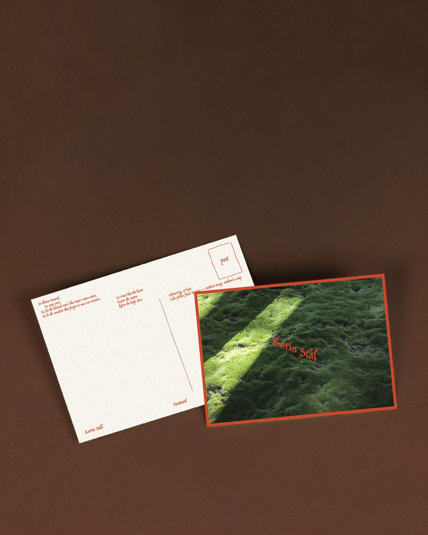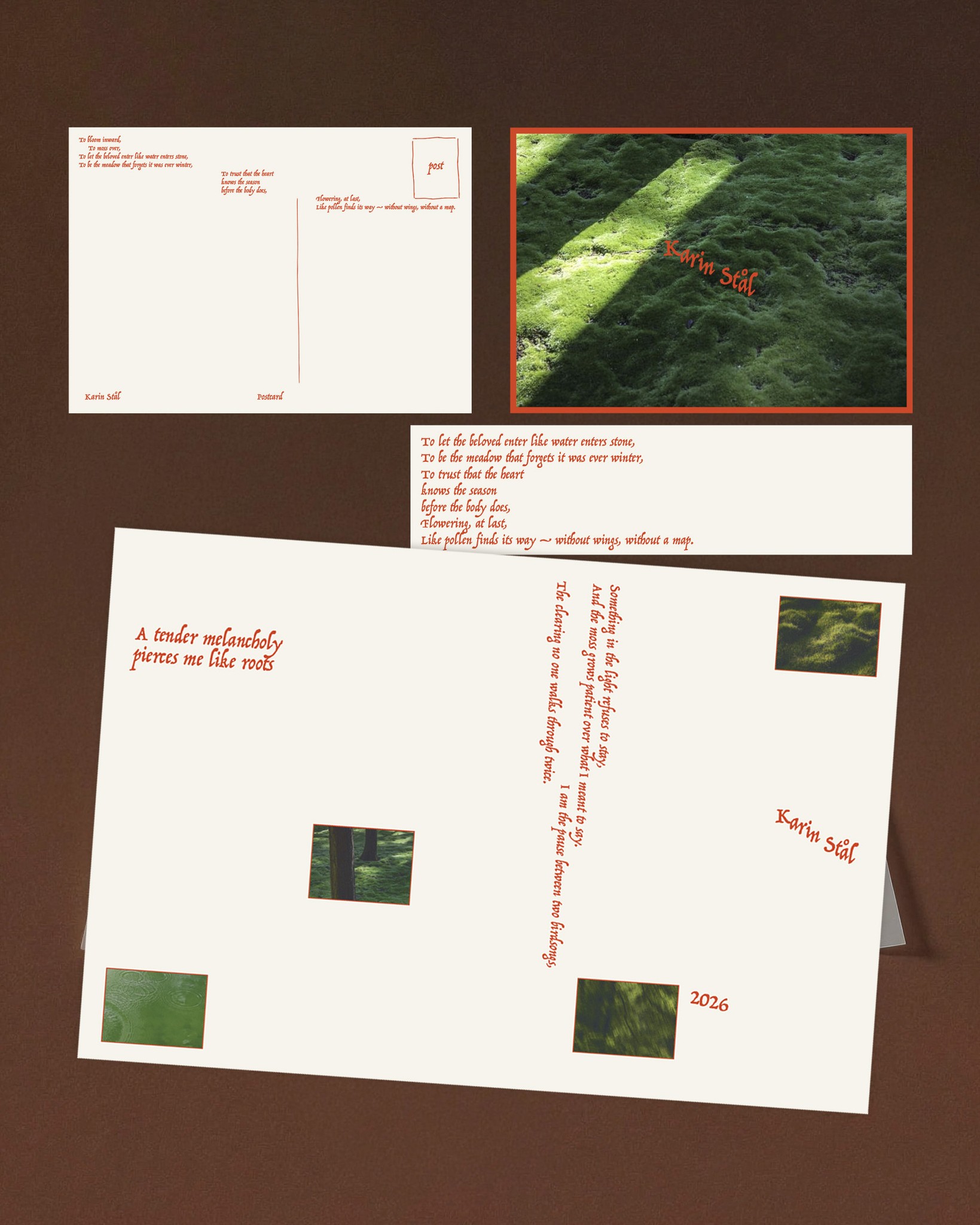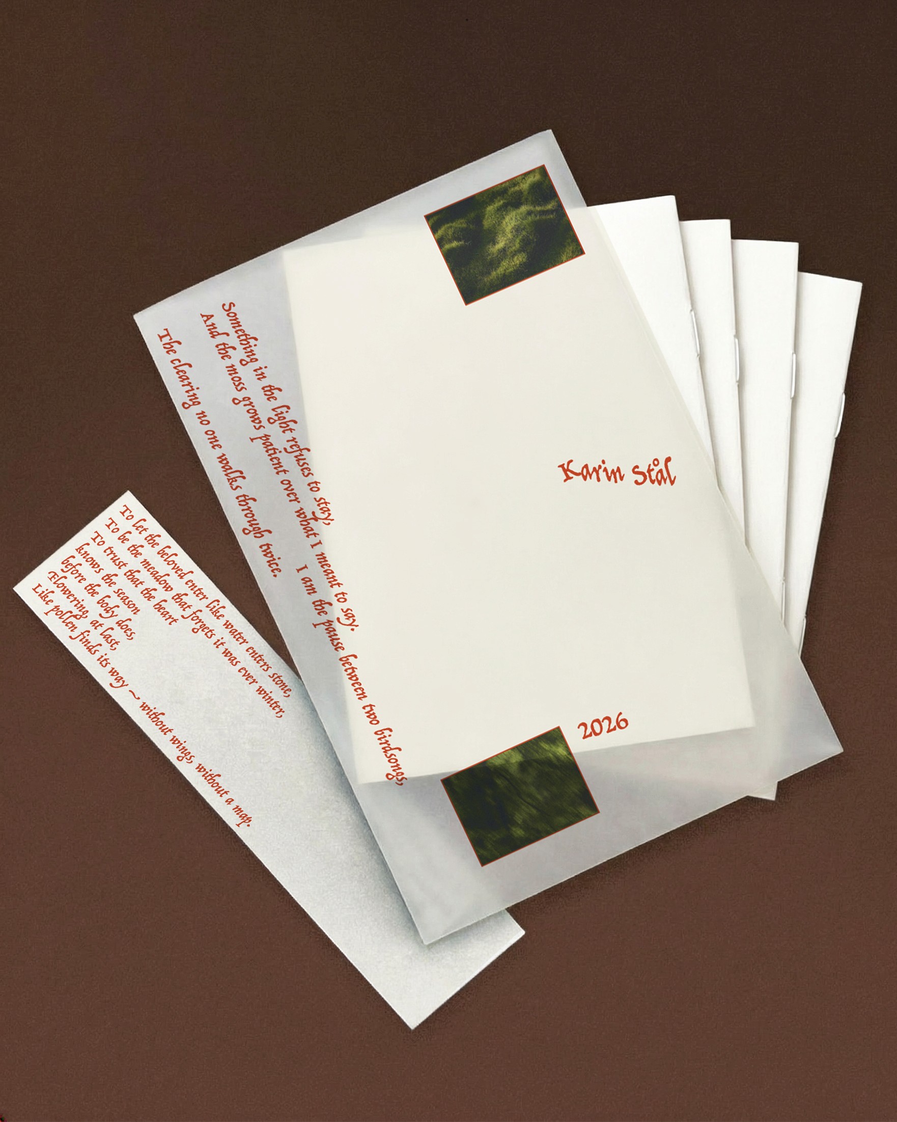 A booklet accompanying Karin’s latest poetry collections, along with a bookmark and a postcard. We sought to subtly highlight the sense of space found in the themes Karin explores: nature and solitude.